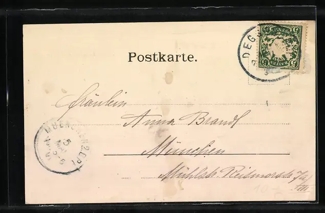Personenbezogene Daten auf der Rückseite der Karte wurden durch blauen Textmarker unkenntlich gemacht. Die blauen Stellen sind auf die Vorderseite durchgeweicht und wirken sich negativ auf das Postkartenfoto aus