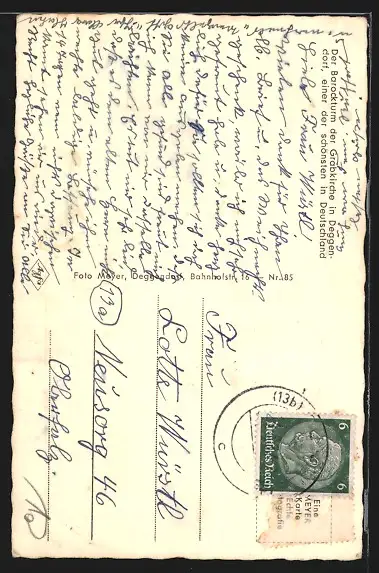 Personenbezogene Daten auf der Rückseite der Karte wurden durch blauen Textmarker unkenntlich gemacht. Die blauen Stellen sind auf die Vorderseite durchgeweicht und wirken sich negativ auf das Postkartenfoto aus