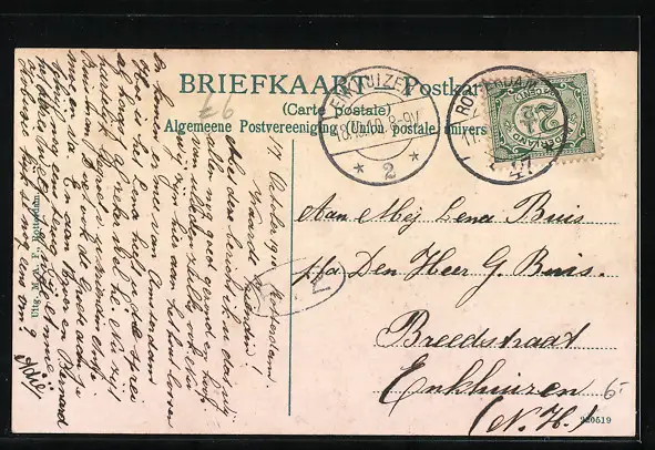 Personenbezogene Daten auf der Rückseite der Karte wurden durch blauen Textmarker unkenntlich gemacht. Die blauen Stellen sind auf die Vorderseite durchgeweicht und wirken sich negativ auf das Postkartenfoto aus