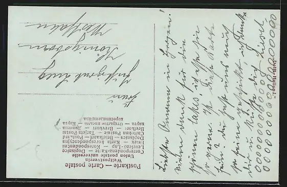 Personenbezogene Daten auf der Rückseite der Karte wurden durch blauen Textmarker unkenntlich gemacht. Die blauen Stellen sind auf die Vorderseite durchgeweicht und wirken sich negativ auf das Postkartenfoto aus