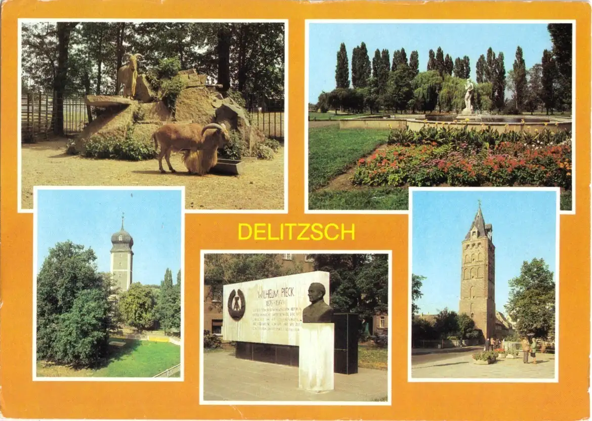 Ansichtskarte Delitzsch fünf Abb. - Im Tierpark, Brunnengruppe "Genesung", Blick zum Schloß, Wilhelm-Pieck-Ehrenmal, Breiter Turm Erhaltung I-II, Beförderungsspuren postalisch gelaufen, gestempelt: Delitzsch, 11.7.85 Druckvermerk: 1984 Herstellungsland: DDR Verlag: Bild und Heimat, Reichenbach i. V. - 01 13 0284/03