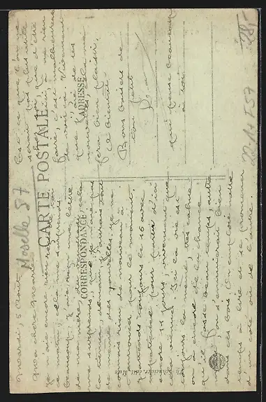 Personenbezogene Daten auf der Rückseite der Karte wurden durch blauen Textmarker unkenntlich gemacht. Die blauen Stellen sind auf die Vorderseite durchgeweicht und wirken sich negativ auf das Postkartenfoto aus