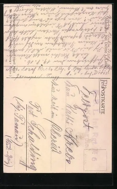 Personenbezogene Daten auf der Rückseite der Karte wurden durch blauen Textmarker unkenntlich gemacht. Die blauen Stellen sind auf die Vorderseite durchgeweicht und wirken sich negativ auf das Postkartenfoto aus
