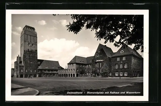 AK Delmenhorst, Strassenpartie am Bismarckplatz mit Rathaus und Wasserturm