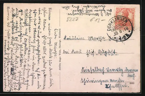 Personenbezogene Daten auf der Rückseite der Karte wurden durch blauen Textmarker unkenntlich gemacht. Die blauen Stellen sind auf die Vorderseite durchgeweicht und wirken sich negativ auf das Postkartenfoto aus