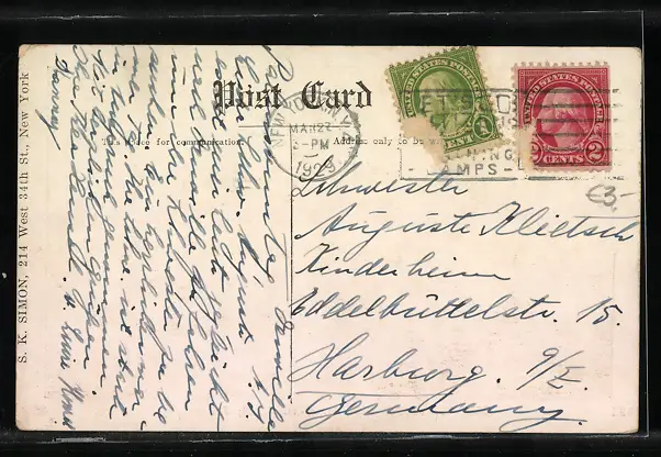 Personenbezogene Daten auf der Rückseite der Karte wurden durch blauen Textmarker unkenntlich gemacht. Die blauen Stellen sind auf die Vorderseite durchgeweicht und wirken sich negativ auf das Postkartenfoto aus