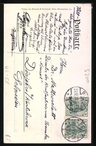 Personenbezogene Daten auf der Rückseite der Karte wurden durch blauen Textmarker unkenntlich gemacht. Die blauen Stellen sind auf die Vorderseite durchgeweicht und wirken sich negativ auf das Postkartenfoto aus