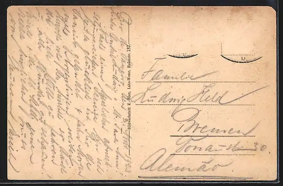 alte Ansichtskarte, gelaufen, Briefmarke entfernt, rückseitig Oberflächenschaden, guter Zustand