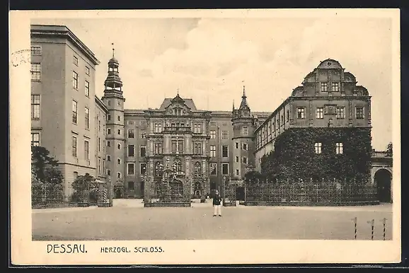 AK Dessau, Herzogl. Schloss, mit Wachsoldat