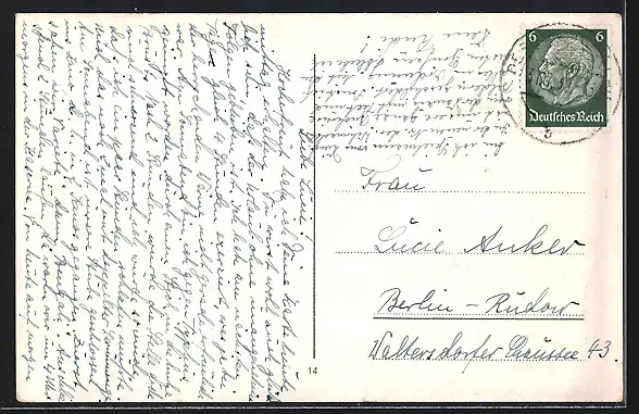 Personenbezogene Daten auf der Rückseite der Karte wurden durch blauen Textmarker unkenntlich gemacht. Die blauen Stellen sind auf die Vorderseite durchgeweicht und wirken sich negativ auf das Postkartenfoto aus
