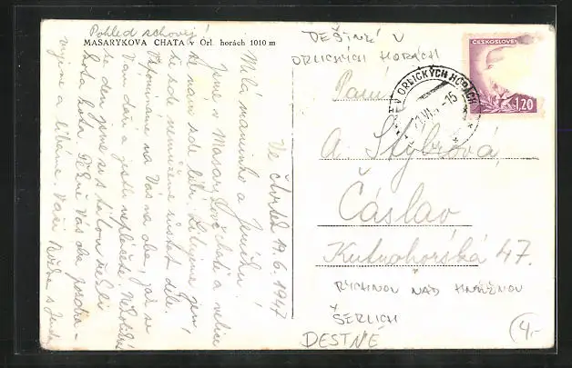 gelaufen 1947, Briefmarke tw. entfernt, guter Zustand