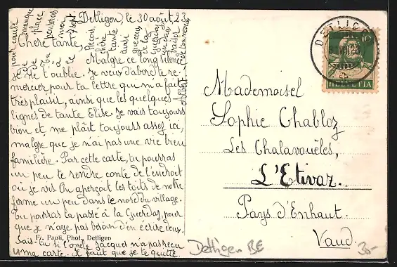 Personenbezogene Daten auf der Rückseite der Karte wurden durch blauen Textmarker unkenntlich gemacht. Die blauen Stellen sind auf die Vorderseite durchgeweicht und wirken sich negativ auf das Postkartenfoto aus