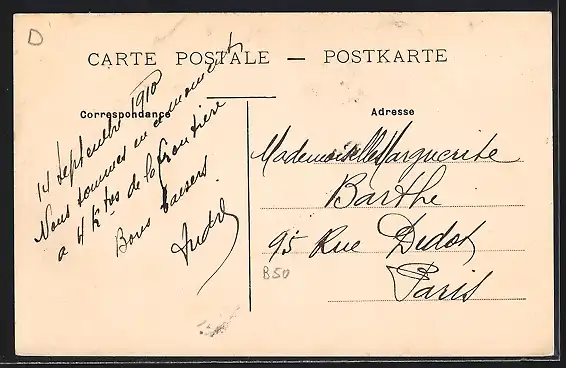 Personenbezogene Daten auf der Rückseite der Karte wurden durch blauen Textmarker unkenntlich gemacht. Die blauen Stellen sind auf die Vorderseite durchgeweicht und wirken sich negativ auf das Postkartenfoto aus