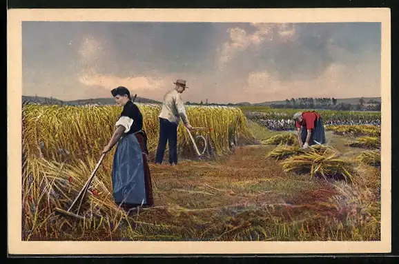 AK Deutsche Ernte, Bauern auf dem Getreidefeld