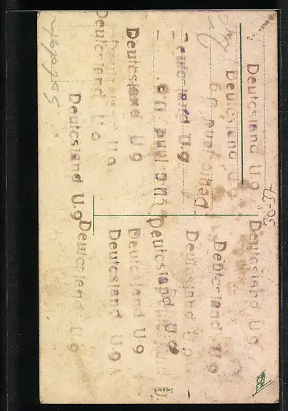 Personenbezogene Daten auf der Rückseite der Karte wurden durch blauen Textmarker unkenntlich gemacht. Die blauen Stellen sind auf die Vorderseite durchgeweicht und wirken sich negativ auf das Postkartenfoto aus