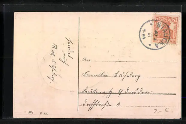Personenbezogene Daten auf der Rückseite der Karte wurden durch blauen Textmarker unkenntlich gemacht. Die blauen Stellen sind auf die Vorderseite durchgeweicht und wirken sich negativ auf das Postkartenfoto aus