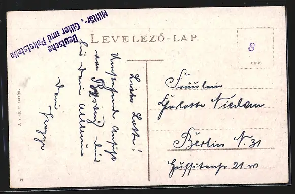 Personenbezogene Daten auf der Rückseite der Karte wurden durch blauen Textmarker unkenntlich gemacht. Die blauen Stellen sind auf die Vorderseite durchgeweicht und wirken sich negativ auf das Postkartenfoto aus