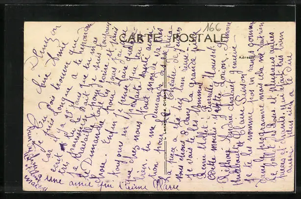 Personenbezogene Daten auf der Rückseite der Karte wurden durch blauen Textmarker unkenntlich gemacht. Die blauen Stellen sind auf die Vorderseite durchgeweicht und wirken sich negativ auf das Postkartenfoto aus