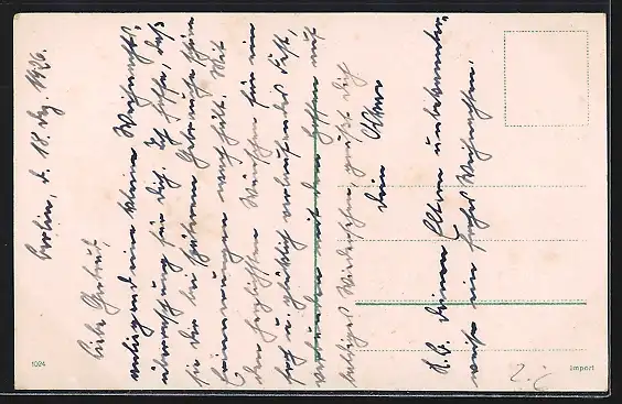 Personenbezogene Daten auf der Rückseite der Karte wurden durch blauen Textmarker unkenntlich gemacht. Die blauen Stellen sind auf die Vorderseite durchgeweicht und wirken sich negativ auf das Postkartenfoto aus