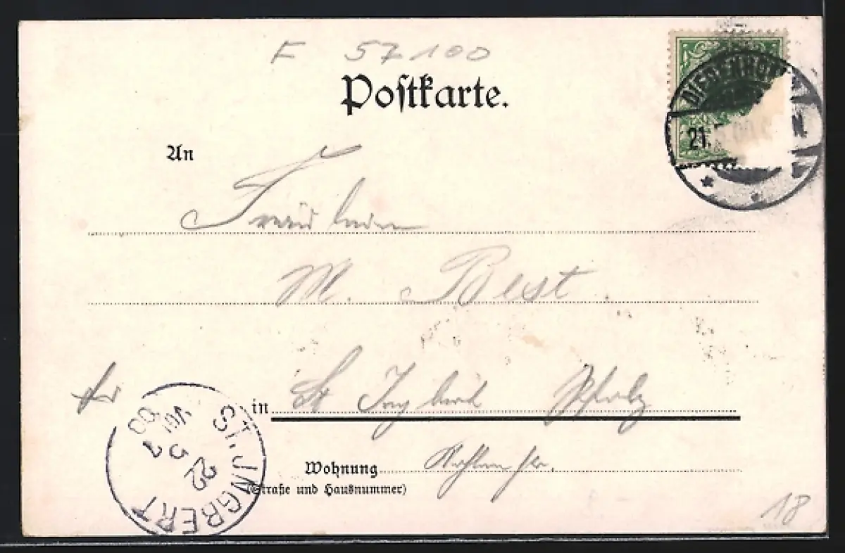 alte Ansichtskarte, gelaufen 1900, Briefmarke entfernt, Eckknick li. oben, guter Zustand
