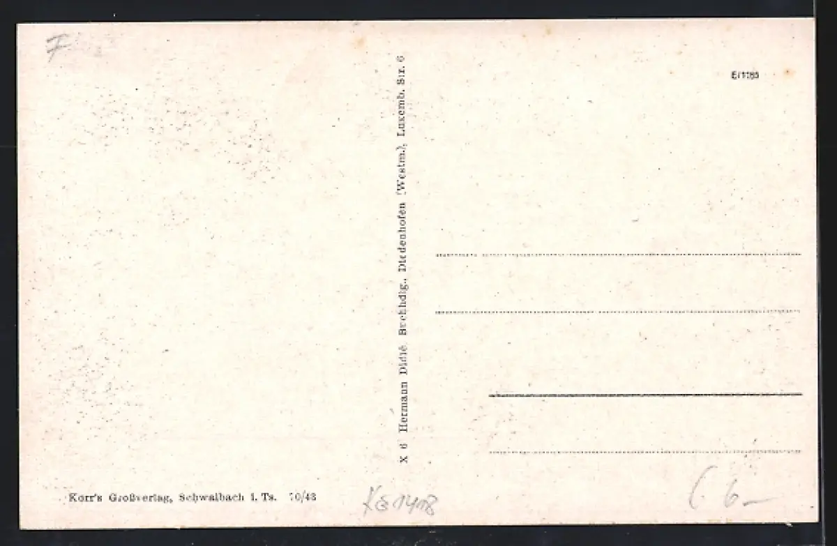 Personenbezogene Daten auf der Rückseite der Karte wurden durch blauen Textmarker unkenntlich gemacht. Die blauen Stellen sind auf die Vorderseite durchgeweicht und wirken sich negativ auf das Postkartenfoto aus