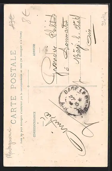 Personenbezogene Daten auf der Rückseite der Karte wurden durch blauen Textmarker unkenntlich gemacht. Die blauen Stellen sind auf die Vorderseite durchgeweicht und wirken sich negativ auf das Postkartenfoto aus