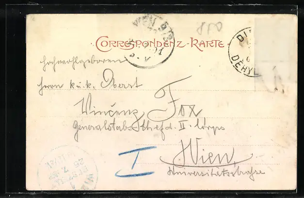 Personenbezogene Daten auf der Rückseite der Karte wurden durch blauen Textmarker unkenntlich gemacht. Die blauen Stellen sind auf die Vorderseite durchgeweicht und wirken sich negativ auf das Postkartenfoto aus