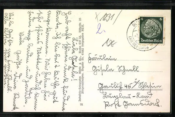 Personenbezogene Daten auf der Rückseite der Karte wurden durch blauen Textmarker unkenntlich gemacht. Die blauen Stellen sind auf die Vorderseite durchgeweicht und wirken sich negativ auf das Postkartenfoto aus