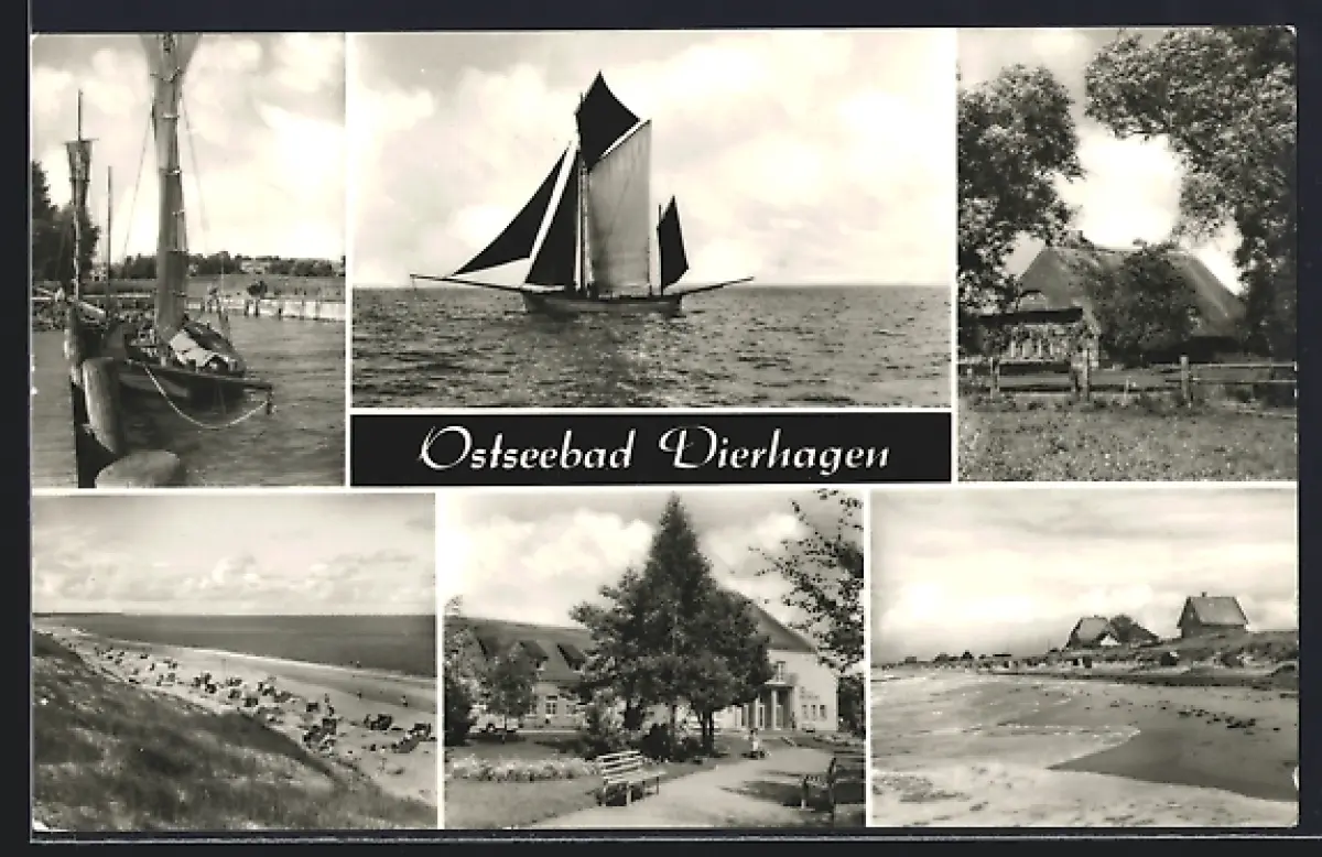 AK Dierhagen, Strand, Segelboote, reetgedeckte Häuser