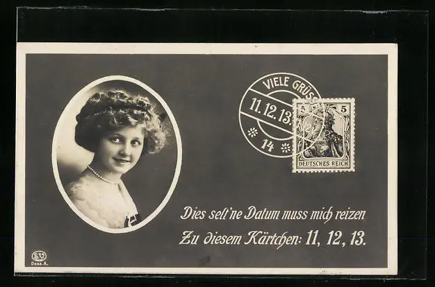 AK Dies selt`ne Datum muss mich reizen..., 11.12.13, Frauenprotrait, Stempel und Briefmarke