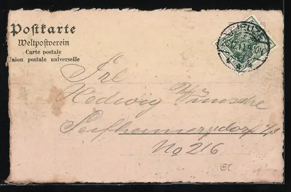 Personenbezogene Daten auf der Rückseite der Karte wurden durch blauen Textmarker unkenntlich gemacht. Die blauen Stellen sind auf die Vorderseite durchgeweicht und wirken sich negativ auf das Postkartenfoto aus