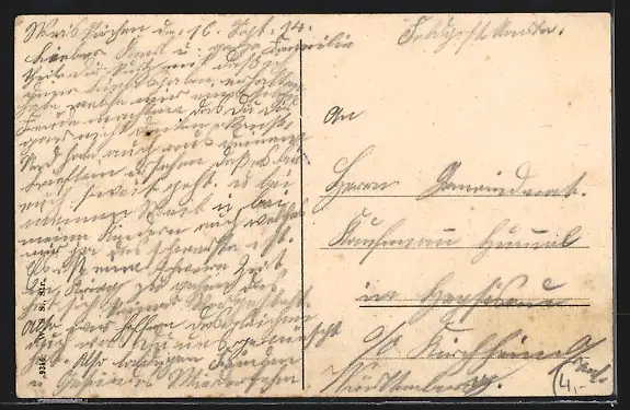 Personenbezogene Daten auf der Rückseite der Karte wurden durch blauen Textmarker unkenntlich gemacht. Die blauen Stellen sind auf die Vorderseite durchgeweicht und wirken sich negativ auf das Postkartenfoto aus