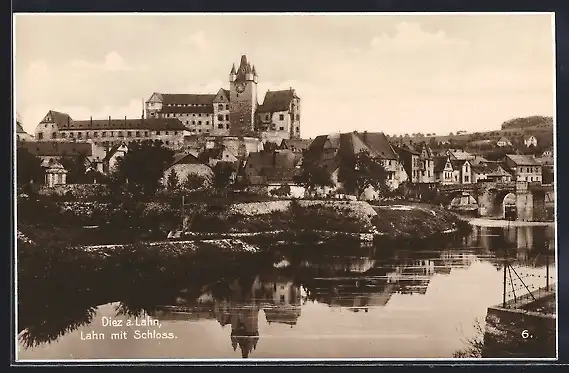 AK Diez a. Lahn, Generalansicht der Stadt mit dem Schloss und der Lahn im Vordergrund