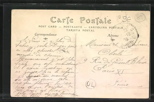Personenbezogene Daten auf der Rückseite der Karte wurden durch blauen Textmarker unkenntlich gemacht. Die blauen Stellen sind auf die Vorderseite durchgeweicht und wirken sich negativ auf das Postkartenfoto aus