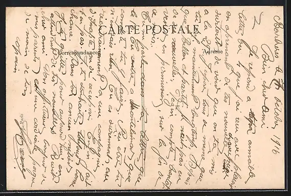 Personenbezogene Daten auf der Rückseite der Karte wurden durch blauen Textmarker unkenntlich gemacht. Die blauen Stellen sind auf die Vorderseite durchgeweicht und wirken sich negativ auf das Postkartenfoto aus