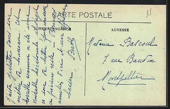 Personenbezogene Daten auf der Rückseite der Karte wurden durch blauen Textmarker unkenntlich gemacht. Die blauen Stellen sind auf die Vorderseite durchgeweicht und wirken sich negativ auf das Postkartenfoto aus