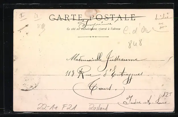 Personenbezogene Daten auf der Rückseite der Karte wurden durch blauen Textmarker unkenntlich gemacht. Die blauen Stellen sind auf die Vorderseite durchgeweicht und wirken sich negativ auf das Postkartenfoto aus
