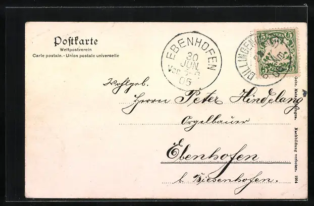 alte Ansichtskarte, gelaufen 1905, Eckknick re. oben, kleiner Einriss re. oben, guter Zustand