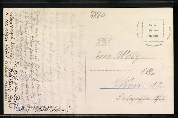 Personenbezogene Daten auf der Rückseite der Karte wurden durch blauen Textmarker unkenntlich gemacht. Die blauen Stellen sind auf die Vorderseite durchgeweicht und wirken sich negativ auf das Postkartenfoto aus