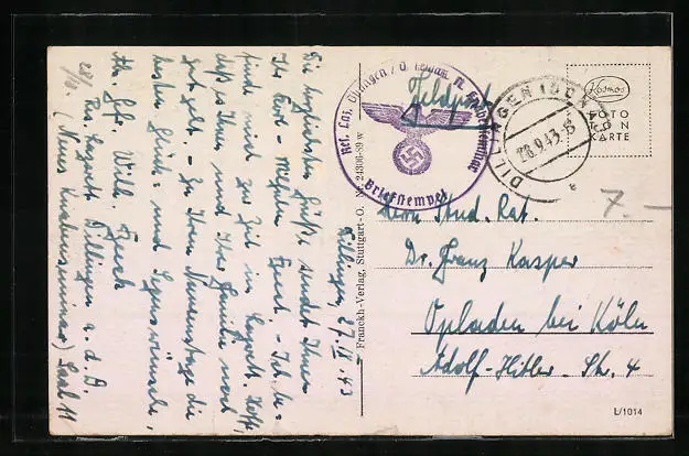 gelaufen als Feldpost 1943, Eckknick re. unten, guter Zustand