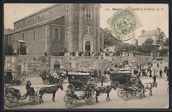 AK Dinard, Sortie de la Messe avec calèches devant l`église