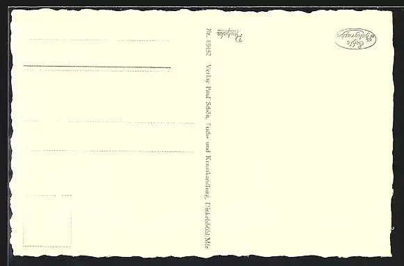 Personenbezogene Daten auf der Rückseite der Karte wurden durch blauen Textmarker unkenntlich gemacht. Die blauen Stellen sind auf die Vorderseite durchgeweicht und wirken sich negativ auf das Postkartenfoto aus