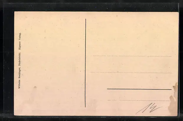 Personenbezogene Daten auf der Rückseite der Karte wurden durch blauen Textmarker unkenntlich gemacht. Die blauen Stellen sind auf die Vorderseite durchgeweicht und wirken sich negativ auf das Postkartenfoto aus