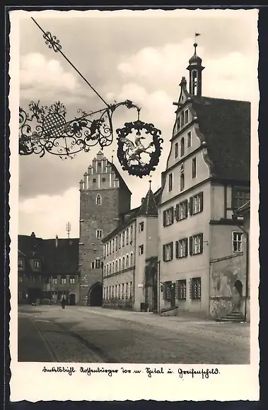 AK Dinkelsbühl, Rothenburger Tor mit Spital und Schild