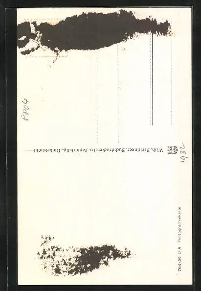 Personenbezogene Daten auf der Rückseite der Karte wurden durch blauen Textmarker unkenntlich gemacht. Die blauen Stellen sind auf die Vorderseite durchgeweicht und wirken sich negativ auf das Postkartenfoto aus