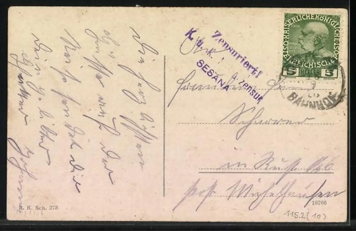 Personenbezogene Daten auf der Rückseite der Karte wurden durch blauen Textmarker unkenntlich gemacht. Die blauen Stellen sind auf die Vorderseite durchgeweicht und wirken sich negativ auf das Postkartenfoto aus