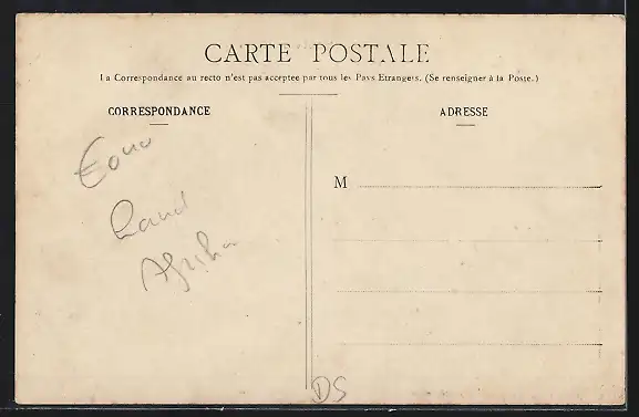 Personenbezogene Daten auf der Rückseite der Karte wurden durch blauen Textmarker unkenntlich gemacht. Die blauen Stellen sind auf die Vorderseite durchgeweicht und wirken sich negativ auf das Postkartenfoto aus