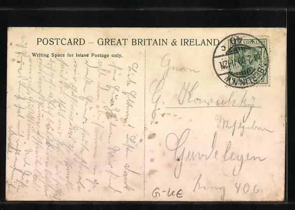 alte Ansichtskarte, gelaufen 1909, Eckknicke unten, minimaler Einriss li. unten, guter Zustand