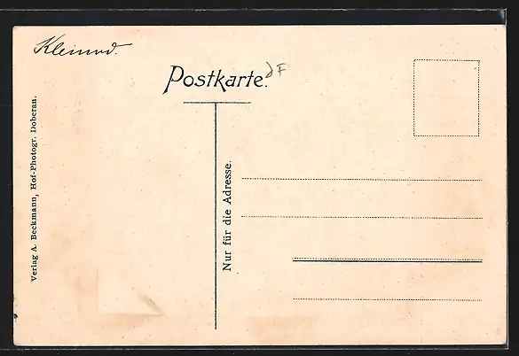 Personenbezogene Daten auf der Rückseite der Karte wurden durch blauen Textmarker unkenntlich gemacht. Die blauen Stellen sind auf die Vorderseite durchgeweicht und wirken sich negativ auf das Postkartenfoto aus