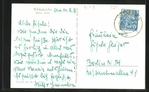 Personenbezogene Daten auf der Rückseite der Karte wurden durch blauen Textmarker unkenntlich gemacht. Die blauen Stellen sind auf die Vorderseite durchgeweicht und wirken sich negativ auf das Postkartenfoto aus